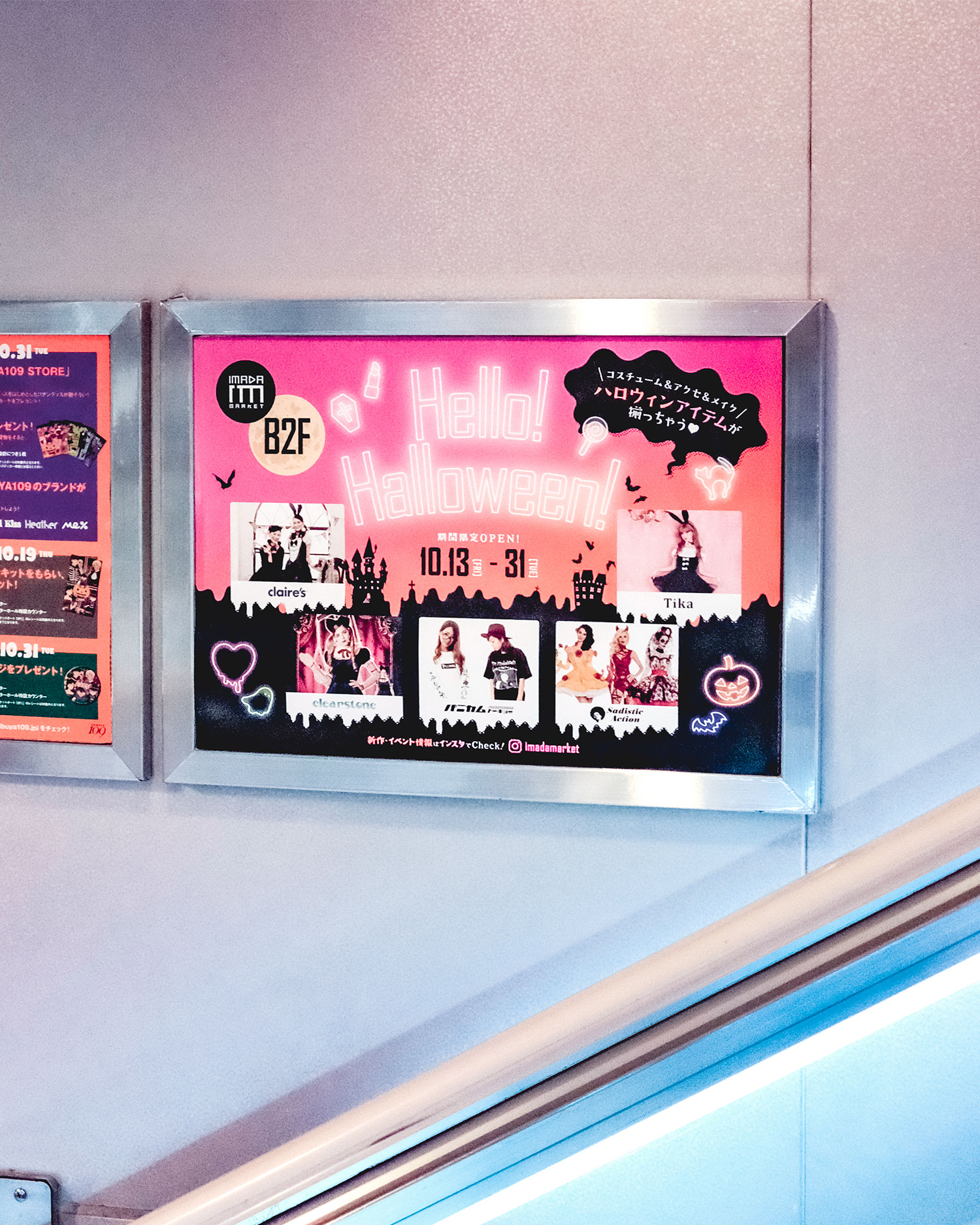 ハロウィンアイテムの企画で、オレンジ ✕ 黒の定番カラーにピンクを入れて店舗イメージと合わせた。ネオン管のようなタイトルとイラストで、ハロウィンらしさを演出した。