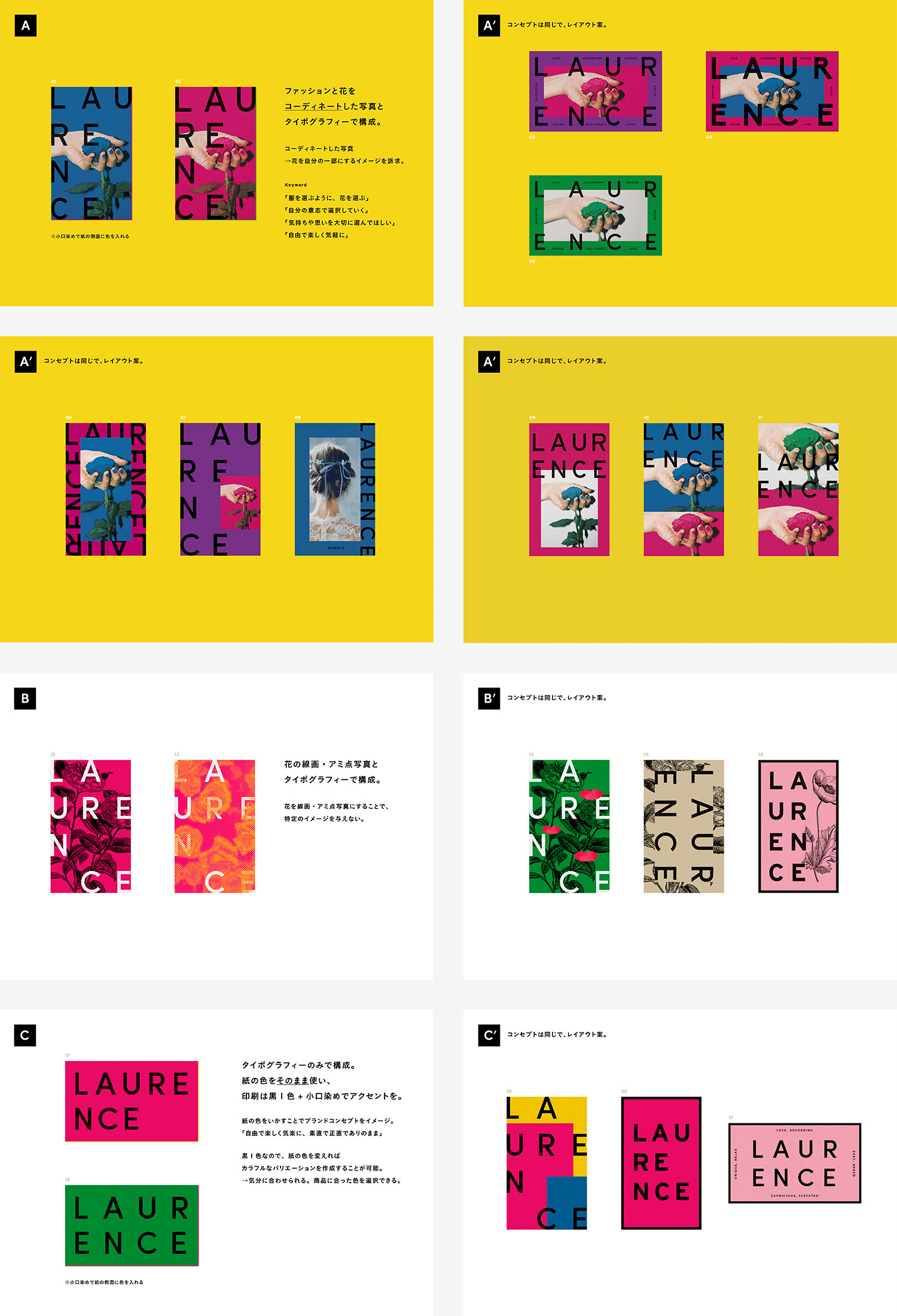 コンセプトと本人の意向や好み、経歴などをもとに、デザインコンセプトとデザイン案を考案。検討の末、シンプルで強い書体と単色のレイアウトに写真を組み合わせたものに決定。
